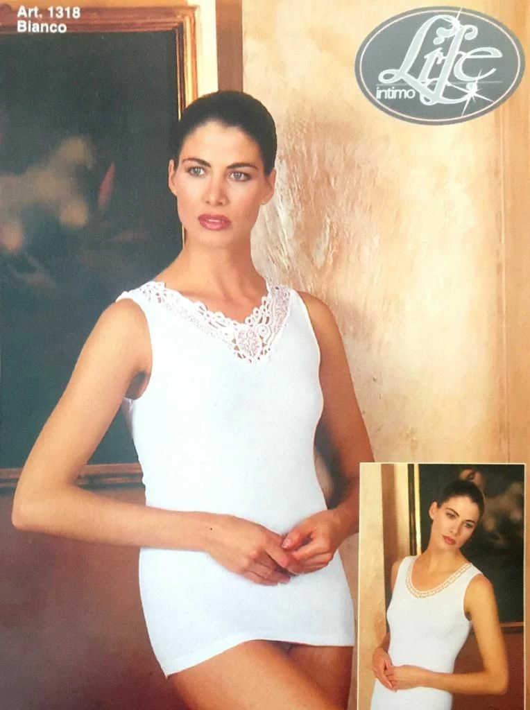 Canottiera Donna spalla larga 100% cotone Life Art.1318 maglia in cotone a costina e pizzo macrame’ sullo scollo ottima vestibilita ‘ e aderenza perfetta