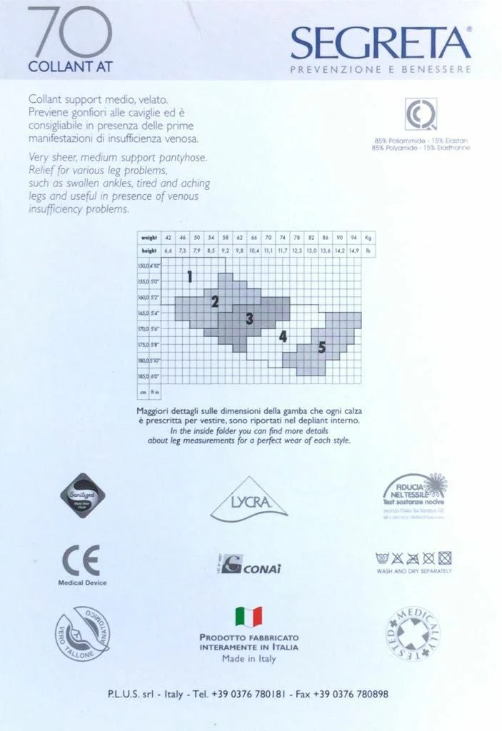 Collant Segreta 70 compressione graduata IBICI support medio, velato, maglia a rete. Corpino rinforzato con elastico applicato, cuciture piatte, tassello in cotone. Con vero tallone anatomico, …