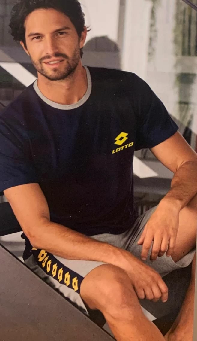 Offerta Outlet Tuta Uomo corta 100%cotone jersey leggero estivo naturale ed anallergico con maglietta T-Shirt girocollo con scritta e logo Lotto sul davanti e pantalone corto con logo con comodo laccetto stringi vita e tasche sul davanti