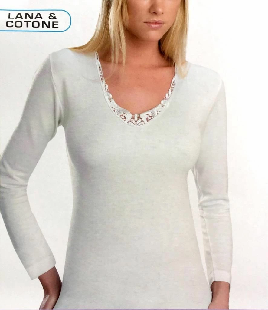 Maglia Donna Manica Lunga Ciessetti 4002 cotone 100% sulla pelle e misto lana all’esterno ,pizzo macrame’ sullo scollo.