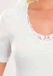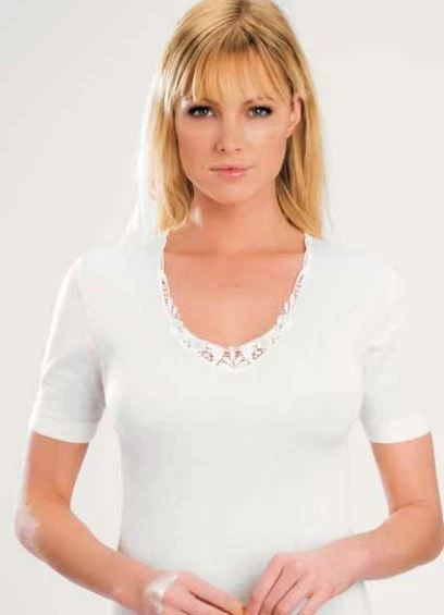 Maglia Donna mezza manica CST in Misto lana esternamete e 100% cotone intenamente arricchita sul davanti da un pizzo macrame’ ,massimo confort e una perfetta aderenza.Qualita’ superiore Made in Italy