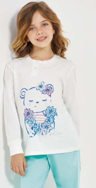 Pigiama Bambina lungo Il GRANCHIETTO 7038 con maglia aperta a serafino con bottoni con polso e bordo e pantalone lungo von bordo alle caviglie tutto in puro cotone 100% jersey leggero e antiallergico