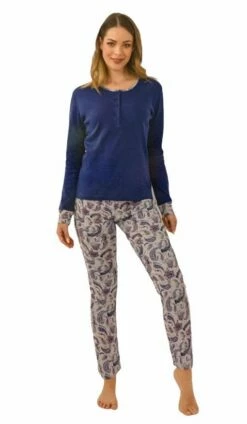 Offerta outlet Pigiama Donna IL Granchio 6006 100% cotone pesante caldo invernale naturale ed anallergico con maglia tinta unita aperta a serafino con stampa e pantalone fantasia con orlo alle caviglie. Prodotto con materiali di altissima qualita’