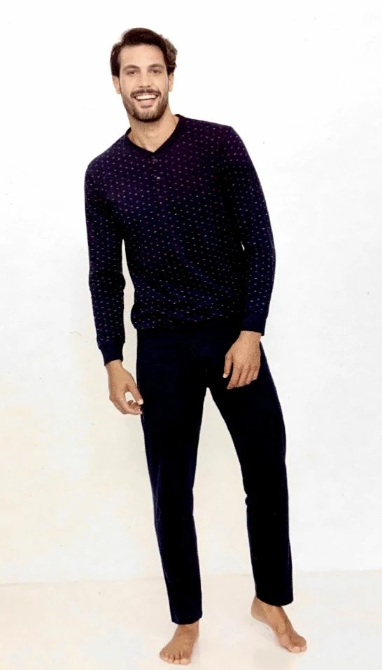 Offerta outlet Pigiama Uomo lungo 100% cotone leggero estivo jersey naturale ed anallergico con maglia manica lunga fantasia cravatta piccola con bordo in vita e polsini, aperta a serafino due bottone e pantalone lungo tinta unita con bordi alle caviglie.