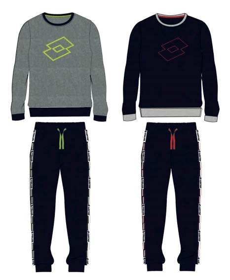 Offerta outlet Tuta casa pigiama uomo lungo 100% cotone leggero estivo jersey naturale ed anallergico con maglia manica lunga girocollo con logo Lotto tinta unita e, bordo in vita e polsini, pantalone lungo tinta unita con banda logata laterale con bordi alle caviglie e tasca dietro.
