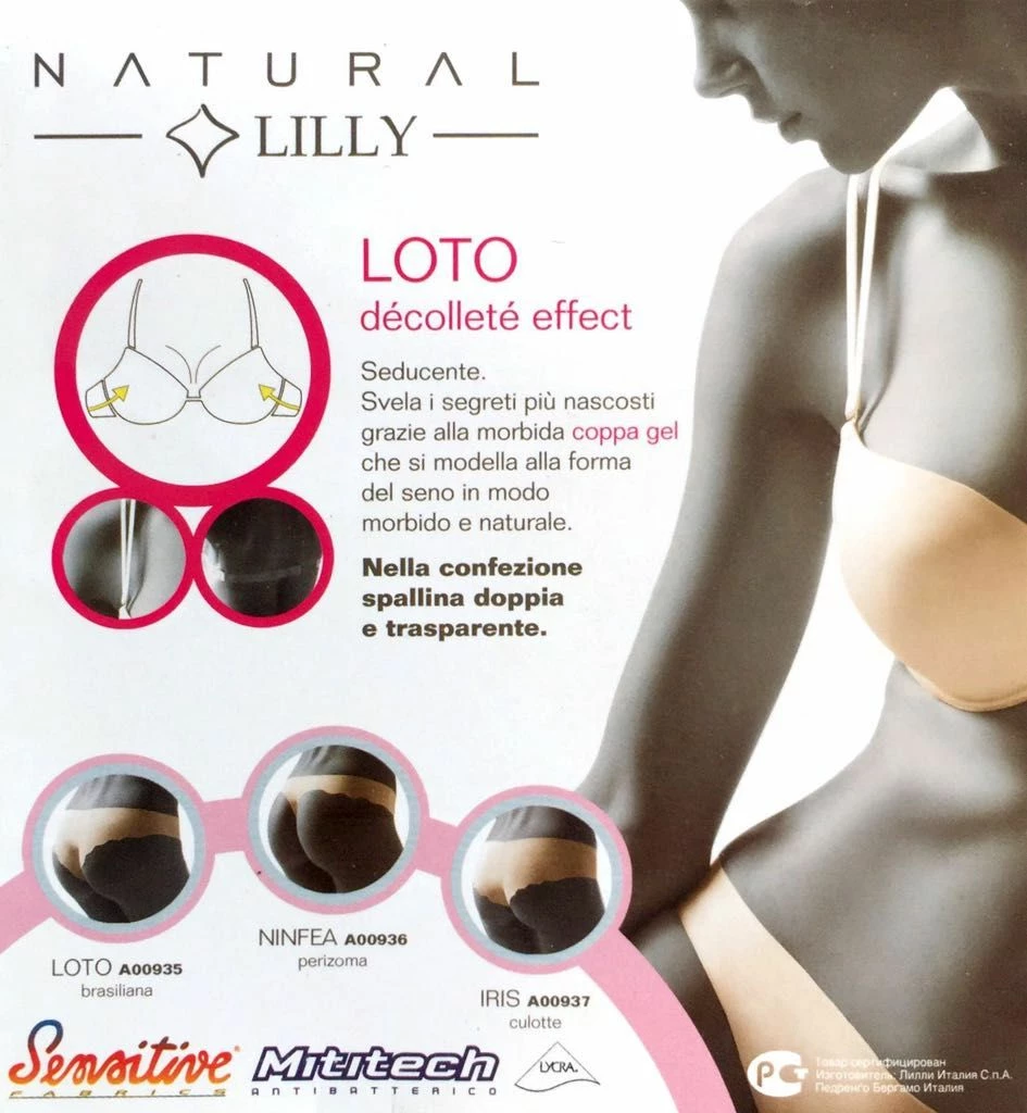 Reggiseno Balconcino Push-Up Lilly Art. 934 in microfibra liscia senza cuciture.Grazie alla morbida coppa gel si modella perfettamente al seno in modo naturale.Le bretelle sono sganciabili e sostituibili con quelle traspareti in dotazione omaggio.
